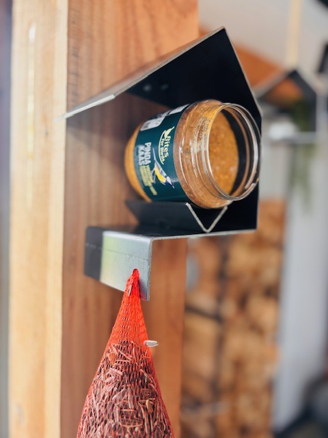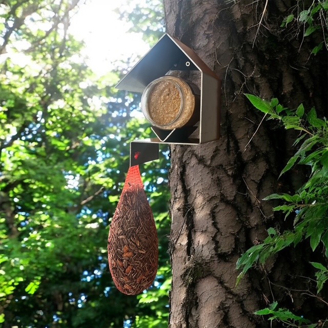 Naast de ruimte voor een pindakaaspot, bevat het ontwerp ook een extra ophanggat voor een pindanetje, mezenbol of vetbol. Zo bied je tuinvogels nóg meer lekkers en trek je verschillende soorten aan, van koolmezen tot roodborstjes.